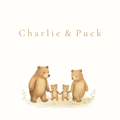 Dit is een lief geboortetegeltje voor jullie tweeling. Het tegeltje heeft een lieve afbeelding van een berenfamilie. Pas het tegeltje naar wens aan in onze online editor.