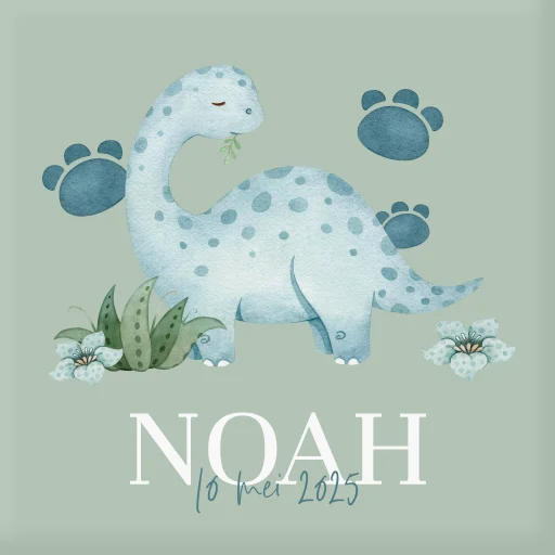 Een vrolijk geboorte tegeltje met groene achtergrond. Op het tegeltje zie je een lieve illustratie van een dino met voetadrukken en bladeren. Onder de dino lees je de naam en geboortedatum van jouw kindje. Pas de tegel aan in onze online editor.
