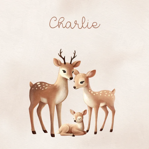 Versier de babykamer met dit lieve tegeltje in de stijl van je geboortekaartje. Het tegeltje in beigetinten heeft een hertengezinnetje in het midden, met daarboven de naam van je kindje.