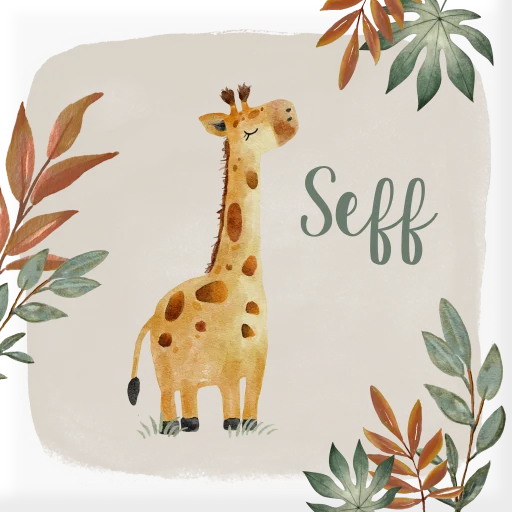 Een vrolijk geboorte tegeltje met een jungle thema. De tegel heeft een beige kader als achtergrond. Daaromheen zie je verschillende jungle bladeren. In het midden zie je een vrolijke giraffe met de naam van jouw kindje. Pas de tegel naar wens aan in onze online editor.