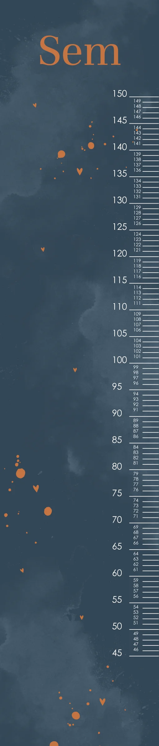 Wat een leuke groeimeter! Naast heel handig staat deze meter ook superleuk in de kinderkamer. De groeimeter heeft een blauwe watercolour achtergrond met koperkleurige spetters. Pas de groeimeter helemaal naar wens aan in onze online opmaaktool.
