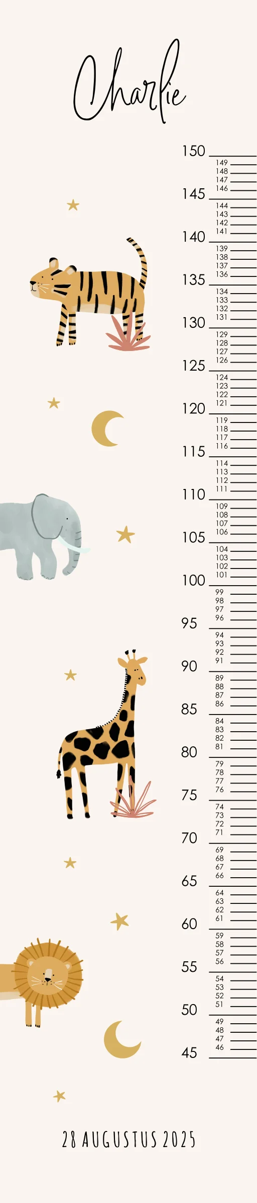 Wat een leuke groeimeter! Naast heel handig staat deze meter ook superleuk in de kinderkamer. Op de groeimeter staan vrolijke illustraties van jungledieren. Pas de groeimeter helemaal naar wens aan in onze online opmaaktool.