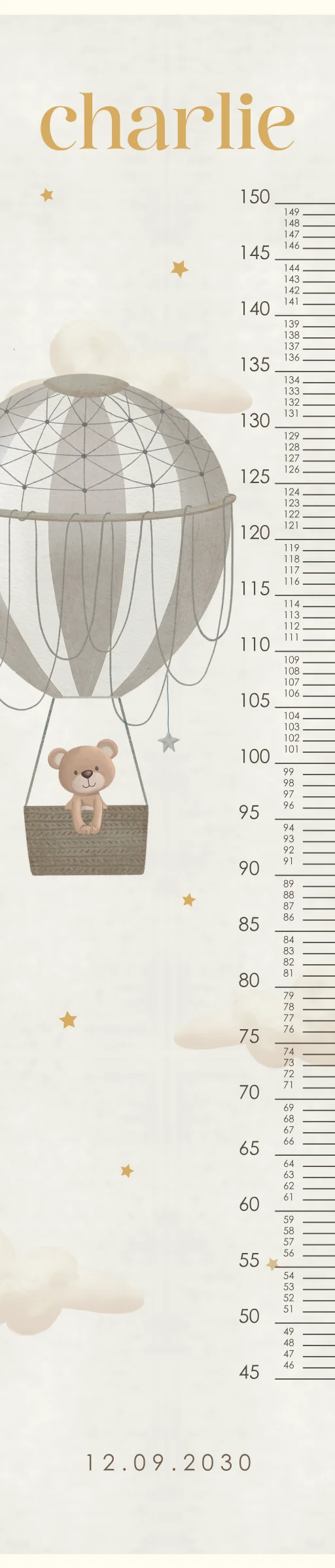 Wat een leuke groeimeter! Naast heel handig staat deze meter ook superleuk in de kinderkamer. Op de groeimeter staat een lieve illustratie van een beertje in een luchtballon. Pas de groeimeter helemaal naar wens aan in onze online opmaaktool.