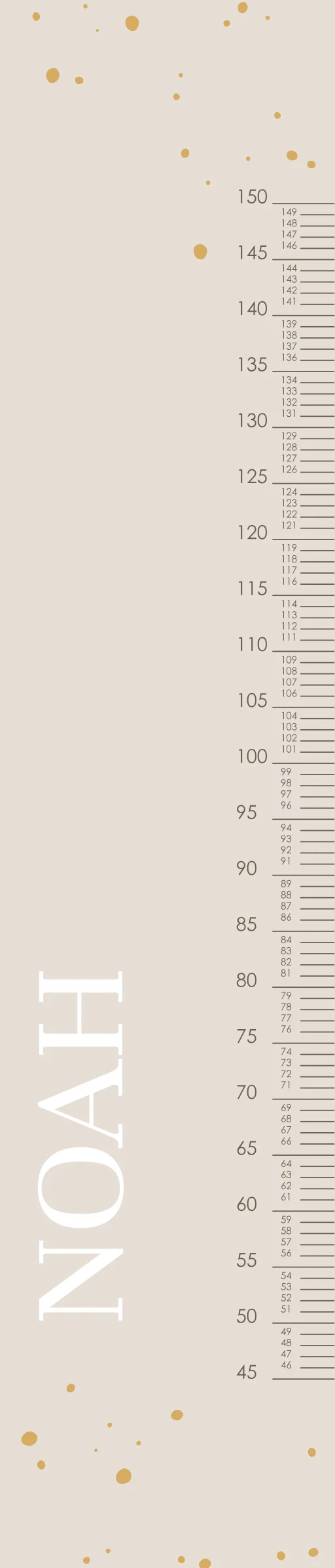 Wat een leuke groeimeter! Naast heel handig staat deze meter ook superleuk in de kinderkamer. De groeimeter heeft een lichte achtergrond met daarop de naam van jullie kindje en spetters in goudkleur. Pas de groeimeter helemaal naar wens aan in onze online opmaaktool.