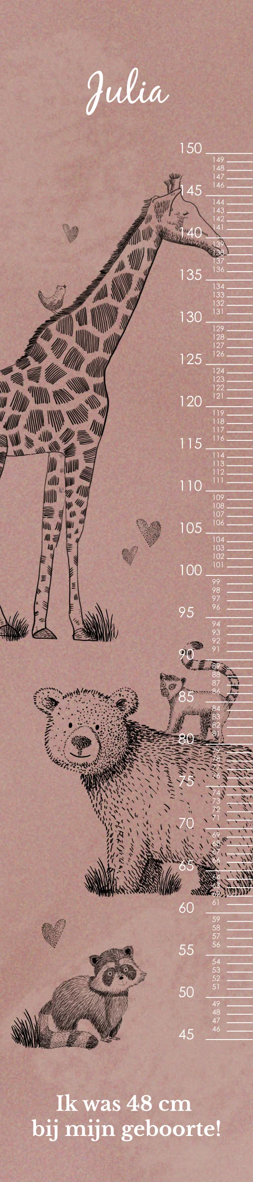 Wat een leuke groeimeter! Naast heel handig staat deze meter ook superleuk in de kinderkamer. De groeimeter heeft een paarse structuur achtergrond met daarop verschillende getekende diertjes. Zo zie je een giraffe, beer, aapje en wasbeertje. Pas de groeimeter helemaal naar wens aan in onze online opmaaktool. Daarnaast is het ook een uniek kraamcadeau!