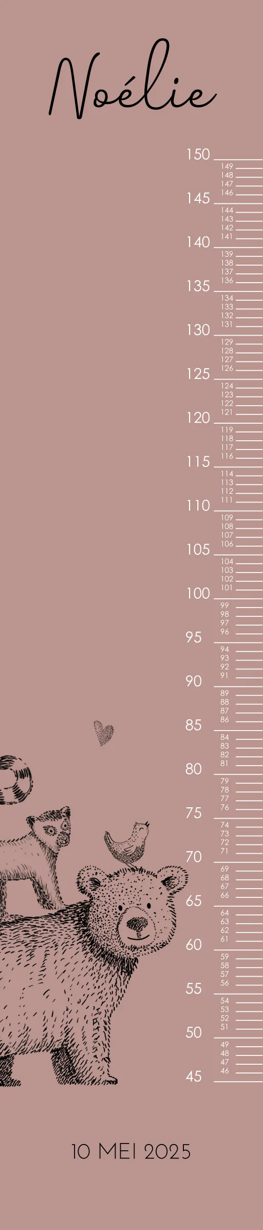 Wat een leuke groeimeter! Naast heel handig staat deze meter ook superleuk in de kinderkamer. De groeimeter heeft een mooie oudroze achtergrond met daarop getekende dieren. Pas de groeimeter helemaal naar wens aan in onze online opmaaktool.