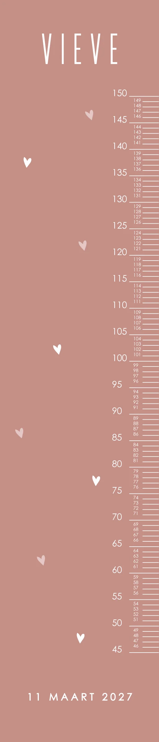Wat een leuke groeimeter! Naast heel handig staat deze meter ook superleuk in de kinderkamer. De groeimeter heeft een roze achtergrond met daarop kleine hartjes. Pas de groeimeter helemaal naar wens aan in onze online opmaaktool.