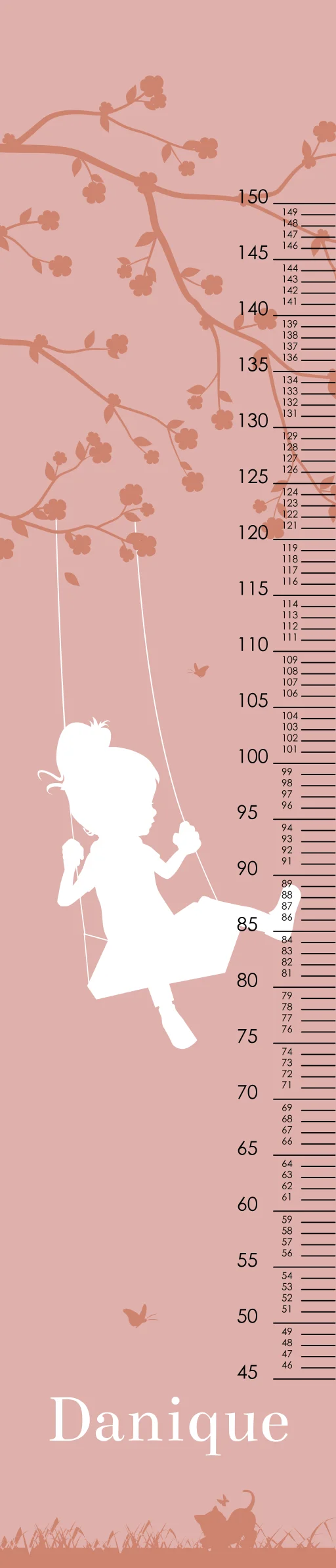 Wat een leuke groeimeter! Naast heel handig staat deze meter ook superleuk in de kinderkamer. De groeimeter heeft een roze achtergrond met daarop het silhouet van een meisje op een schommel. Pas de groeimeter helemaal naar wens aan in onze online opmaaktool.