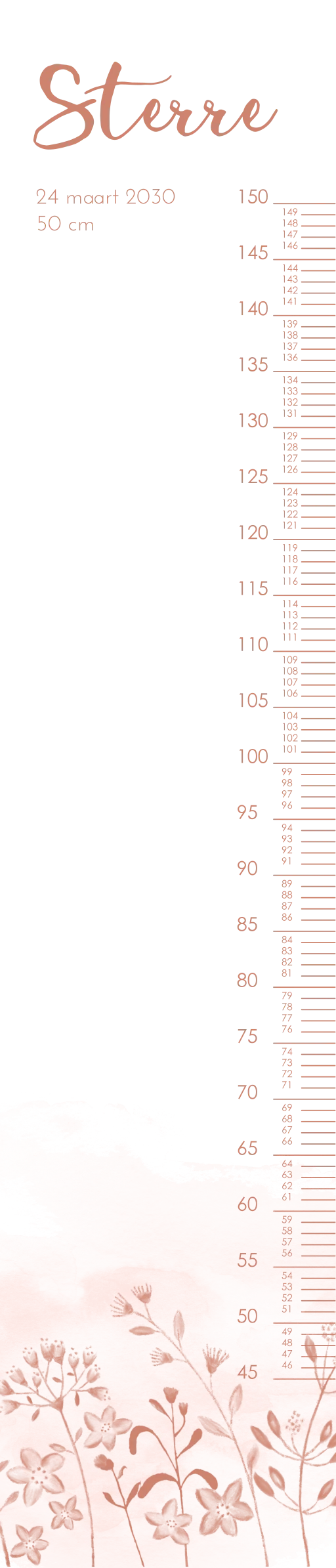 Wat een leuke groeimeter! Naast heel handig staat deze meter ook superleuk in de kinderkamer. De groeimeter heeft een witte achtergrond met daarop mooie handgetekende bloemetjes. Pas de groeimeter helemaal naar wens aan in onze online opmaaktool.