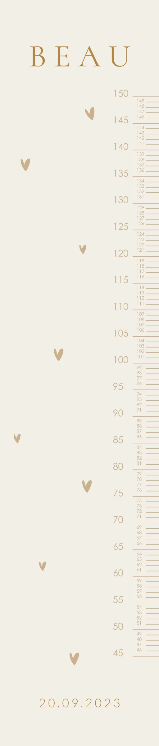Een lieve groeimeter met beige hartjes en naam. Het ontwerp is naar wens aan te passen in onze online editor.