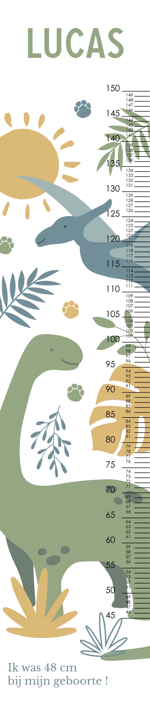 Deze superleuke groeimeter is heel handig én staat superleuk in de kinderkamer. Op de groeimeter staan vrolijke kleuren, een zon, bladeren en stoere dino's. Pas de groeimeter helemaal naar wens aan in onze online opmaaktool. Daarnaast is het ook een uniek kraamcadeau!