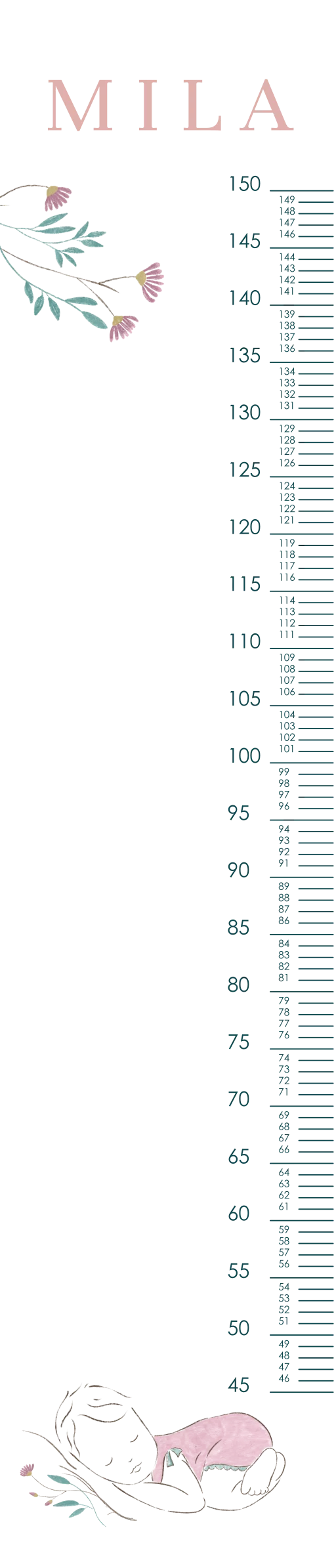 Wat een leuke groeimeter! Naast heel handig staat deze meter ook superleuk in de kinderkamer. Op de groeimeter staan vrolijke pastelkleurige illustraties van een baby en bloemen. Pas de groeimeter helemaal naar wens aan in onze online opmaaktool.