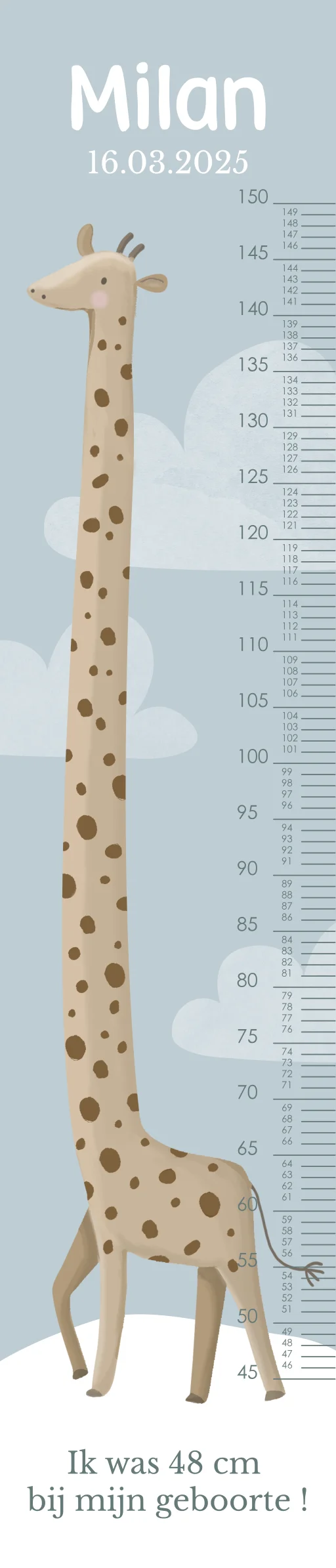 Deze superleuke groeimeter is heel handig én staat superleuk in de kinderkamer. Op de groeimeter staat een hippe giraffe met een extra lange nek, een blauwe achtergrond en witte wolkjes. Pas de groeimeter helemaal naar wens aan in onze online opmaaktool. Daarnaast is het ook een uniek kraamcadeau!