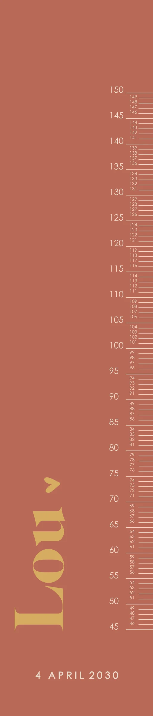 Specificaties groeimeter - Het formaat is 140cm lang en 30cm breed, de groeimeter begint bij 45 cm - De groeimeter wordt geleverd met donkerbruine houten latjes met magneetjes onder en boven - Aan het boven-latje hangt een koordje om op te hangen - Gemaakt van stevig canvas| Totaalprijs: 0 |
