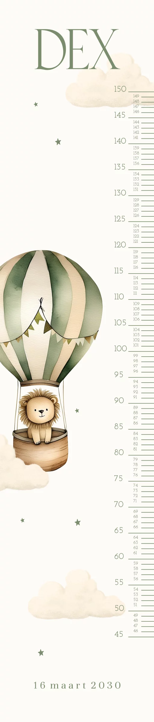 Een lieve avontuurlijke groeimeter voor op de kinderkamer. De groeimeter is passend bij het geboortekaartje. Het ontwerp heeft wolkjes, sterretjes en een leeuwtje in een luchtballon. Pas het ontwerp naar wens zelf aan.