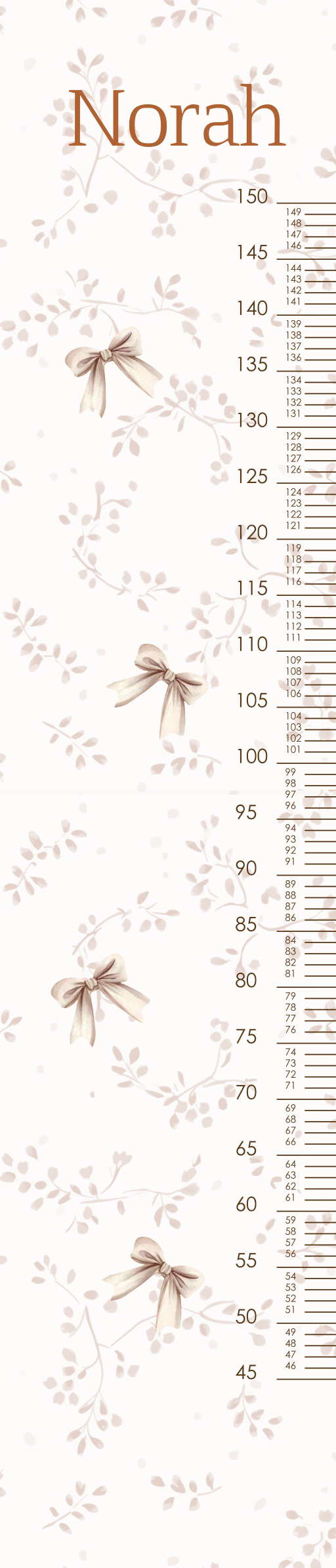 Wat een schattige groeimeter! Naast heel handig staat deze meter ook superleuk in de kinderkamer. Op de groeimeter schattige strikjes en bloemen in lichtroze en beigetinten. Pas de groeimeter helemaal naar wens aan in onze online opmaaktool.