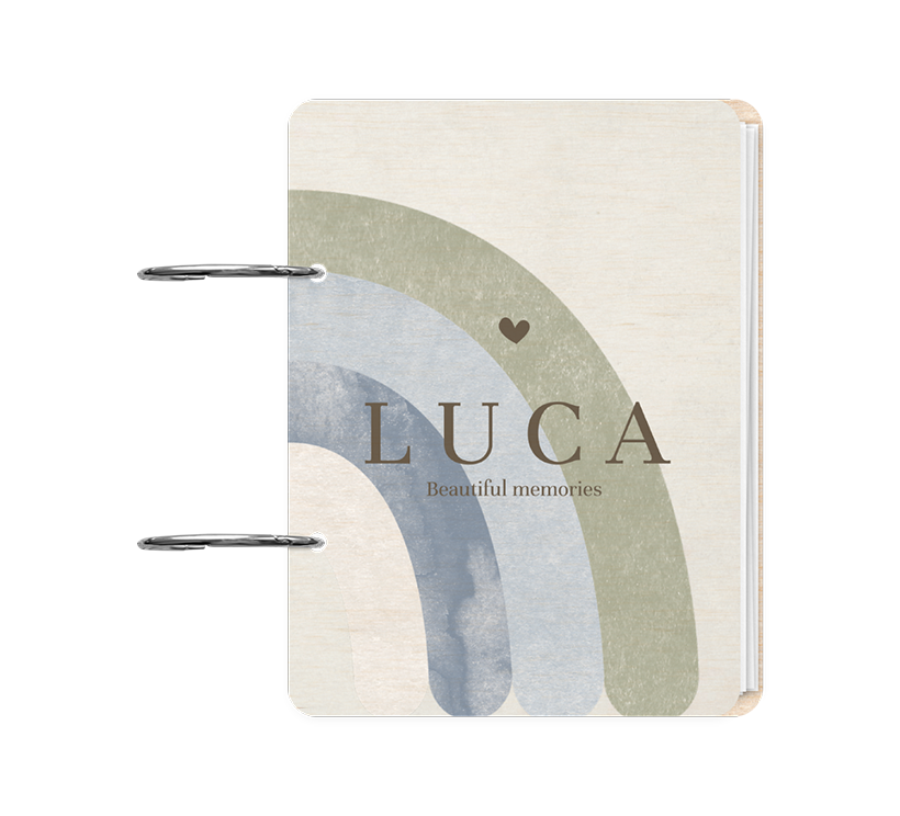 Een houten geboortekaartjes bewaarbundel. Deze bewaarbundel heeft een voorkant met een blauw groene watercolour regenboog. In het midden zie je de naam van jullie kindje. De voorkant is naar wens aan te passen in onze online editor.