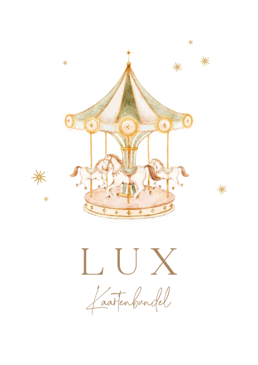 Bundel de geboortekaartjes in deze mooie bewaarbundel. De bundel heeft een illustratie van een pastel gekleurde carrousel met paardjes. Perfect om geboortekaartjes of andere dierbare herinneringen in te bewaren.