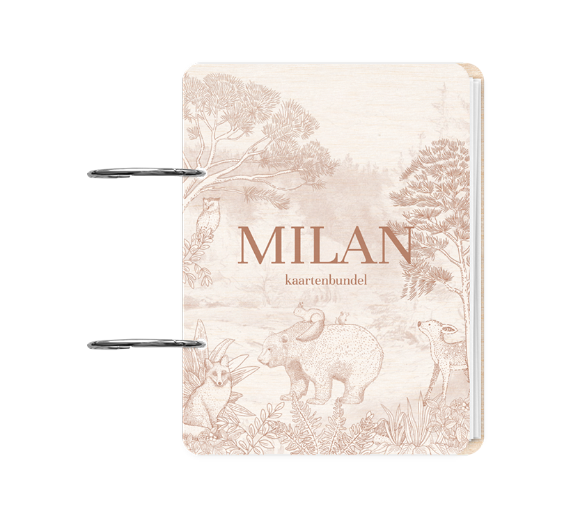 Bewaarbundel geboortekaartje met illustraties bosdieren in roestkleur