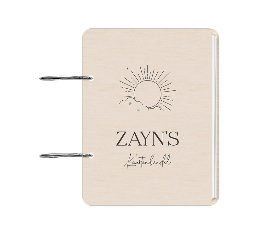 Een trendy en stijlvolle bewaarbundel voor jullie geboortekaartjes. Deze houten voorkant heeft een beige achtergrond met daarop een lijntekening van een zon die voorbij de wolken komt. Onder de zon lees je de naam van jullie kindje. Pas de voorkant naar wens aan in onze online editor.