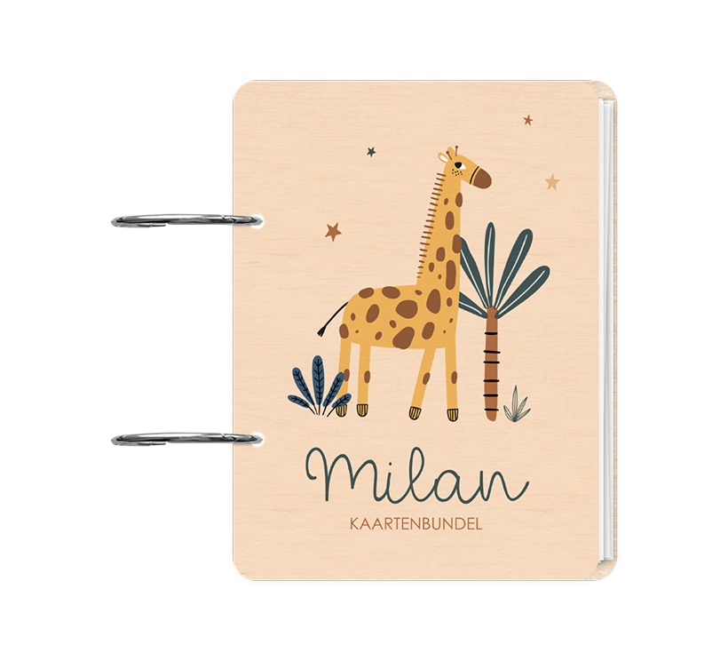 Vrolijk jungle thema voor deze houten geboortekaartjes bewaarbundel. Op de voorkant van deze bundel zie je een illustratie van een giraffe lopend door de jungle onder een sterrenhemel. Onder de illustratie is er ruimte voor de naam van jullie kindje.