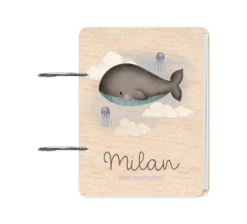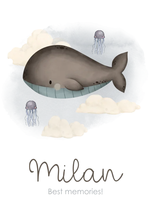 Een dromerig ontwerp voor deze houten geboortekaartjes kaartenbundel. Op de voorkant zie je een lieve walvis tussen de wolkjes en twee kwallen. Onderin lees je de naam van jullie kindje. Pas de voorkant naar wens aan in onze online editor.