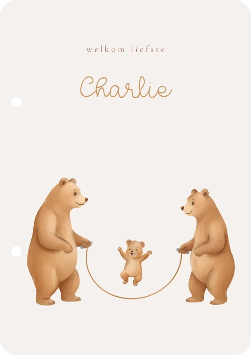 Een lieve houten bewaarbundel bijpassend bij het geboortekaartje. De bundel heeft een lieve illustratie van een berenfamilie die touwtje springt. Pas het ontwerp naar wens zelf aan.