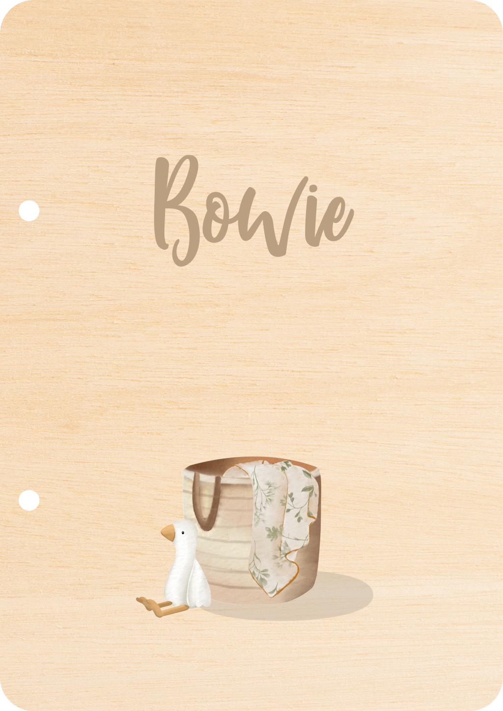 Een schattige kaartje bewaarbundel voor de geboortekaartjes. De voorkant van deze bundel heeft een lieve illustratie van een zittend gansje tegen een mandje. Boven het gansje lees je de naam van jullie kindje. Pas het ontwerp naar wens aan in onze online editor.