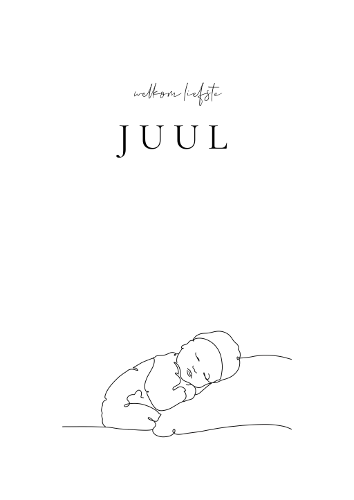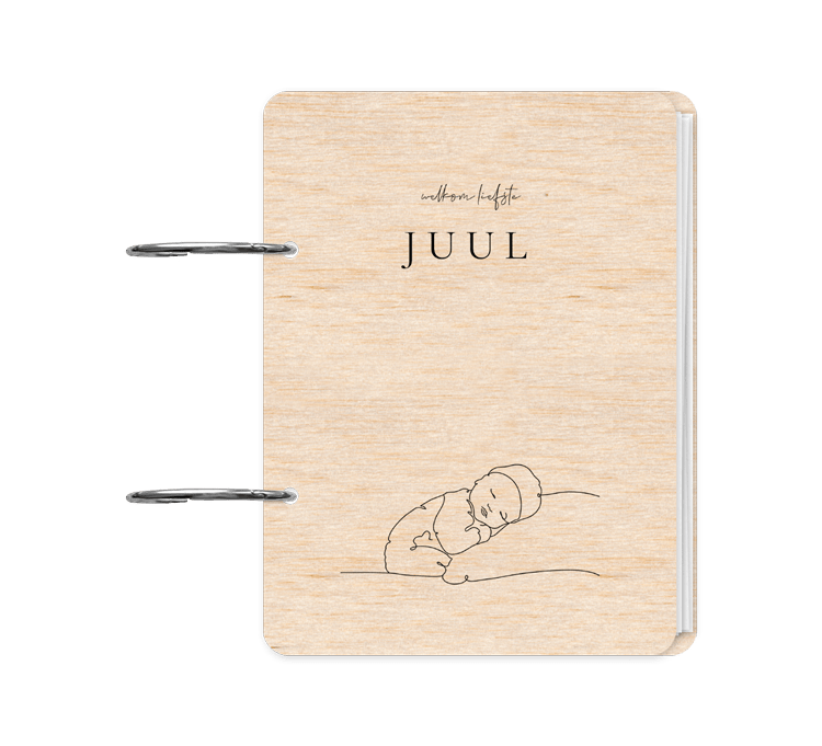 Een stijlvolle houten bewaarbundel voor de geboortekaartjes. Deze bundel heeft een stijlvolle voorkant met een lijntekening van een baby. Ook lees je de naam van jouw kindje op de voorkant. Pas de voorkant naar wens aan in onze online editor.