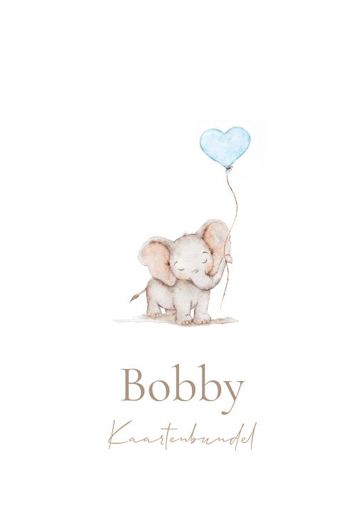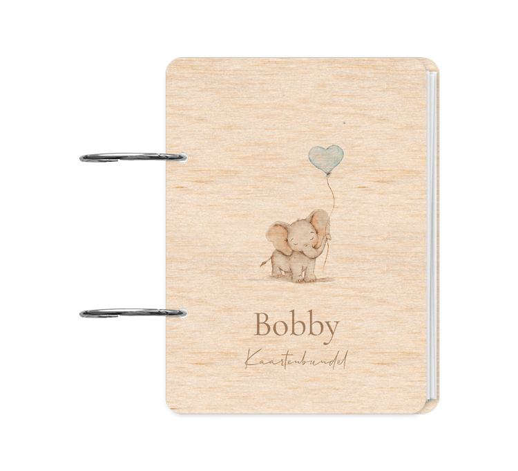Wat een lieve houten bewaarbundel geboortekaartje! Op de bundel kaartje staan een illustratie van een olifantje met een hartjes ballon.