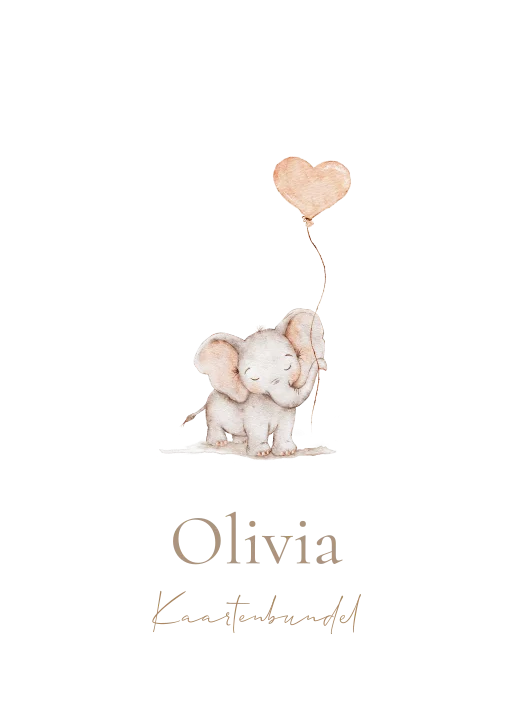 Wat een lieve houten bewaarbundel geboortekaartje! Op de bundel kaartje staan een illustratie van een olifantje met een hartjes ballon.