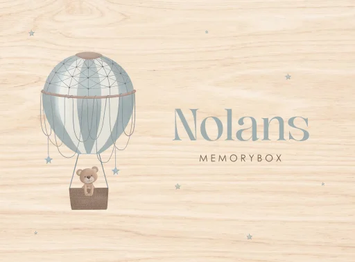Een houten memorybox om herinneringen in te bewaren. Deze box is in de stijl van het geboortekaartje. De box heeft een illustratie van een luchtballon met beertje omringd door sterretjes. Pas het ontwerp naar wens aan in online editor.