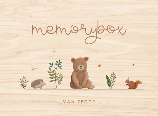 Een toffe houten memorybox met illustraties van vrolijke bosdieren. Het ontwerp is naar wens aan te passen in onze online editor.