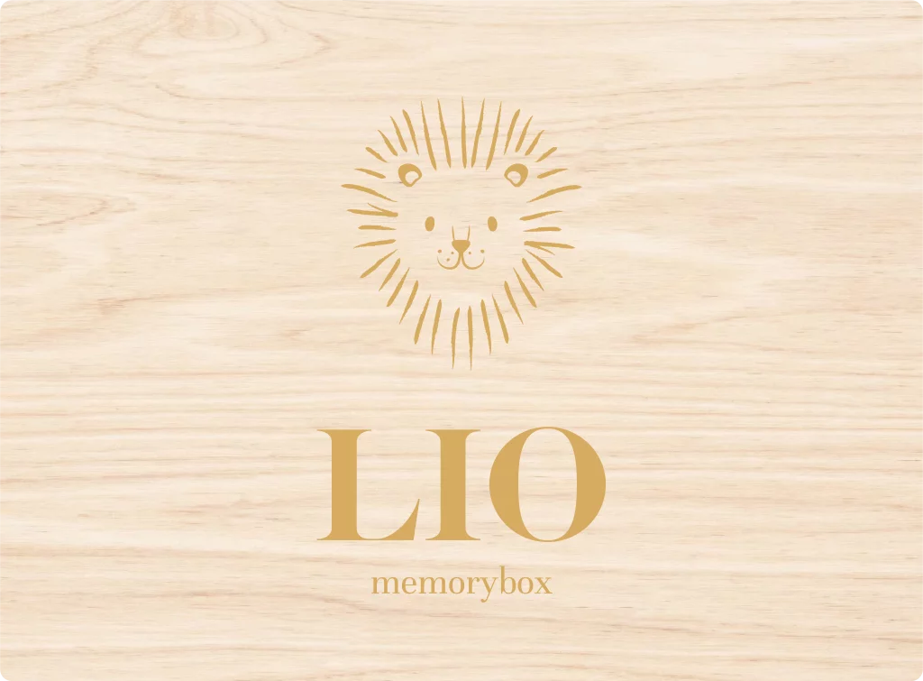 Een stijlvolle memorybox met lief leeuwtje en de naam. De box heeft een witte achtergrond met daarop goudlook kleurige letters en illustratie. Deze grenen houten box heeft een afmeting van 40x30cm breed en 13cm hoog en heeft een handgreep aan elke kant.
