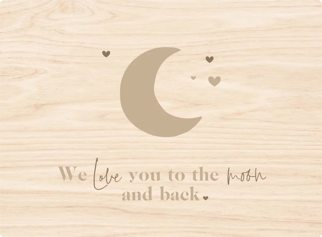 Een trendy memorybox voor spulletjes uit de zwangerschap en babytijd. Prachtige herinneringen voor later. Ook supertof om als kraamcadeau te geven! Op deze memorybox zie je een beige maan omgringd door hartjes met daaronder de tekst: we love you to the moon and back. Pas de memorybox eenvoudig zelf aan in onze online opmaaktool. Deze grenen houten box heeft een afmeting van 40x30cm breed en 13cm hoog en heeft een handgreep aan elke kant.