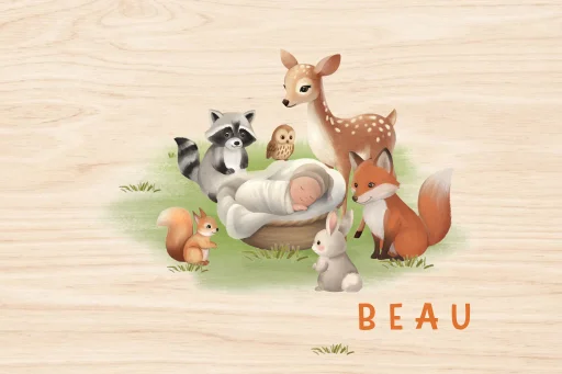 Een memorybox om alle herinneringen van de zwangerschap en/of babytijd te bewaren. Op het deksel zie je een illustratie van een baby in een mandje omringd door lieve bosdieren. Onder de afbeelding staat de naam van het kindje. Leuk voor jezelf om als kraamcadeau te geven. De box is naar wens te personaliseren in onze online editor.