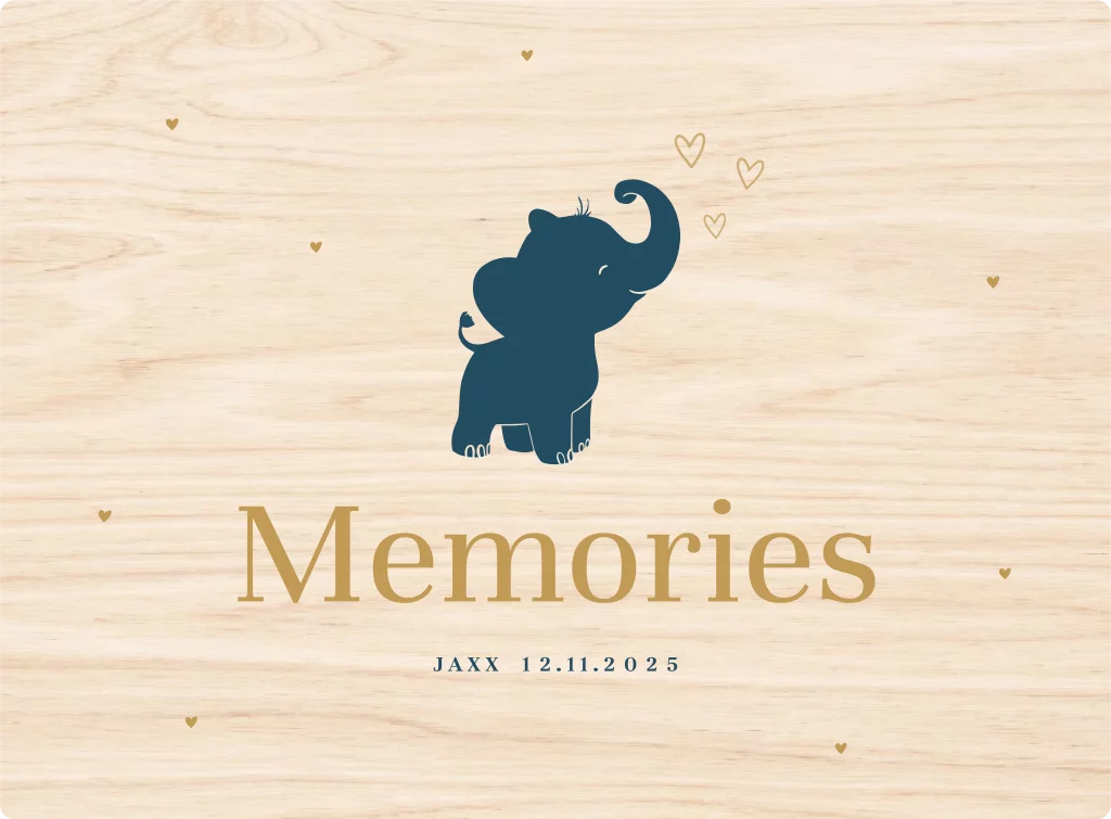 Leuke memorybox in stijl van het geboortekaartje met het silhouet van een lief olifantje in blauw met goudkleurige hartjes er omheen. Deze grenenhouten box heeft een afmeting van 40x30cm breed en 13cm hoog en heeft een handgreep aan elke kant.