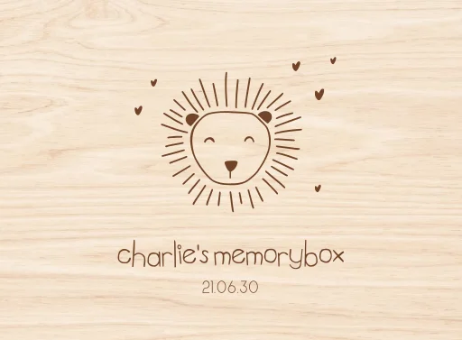 Stoere memorybox in stijl van het geboortekaartje met de getekende leeuwenkop in bruin met lieve hartjes er omheen. Leuk om zo de eerste herinneringen voor jullie kindje te bewaren.