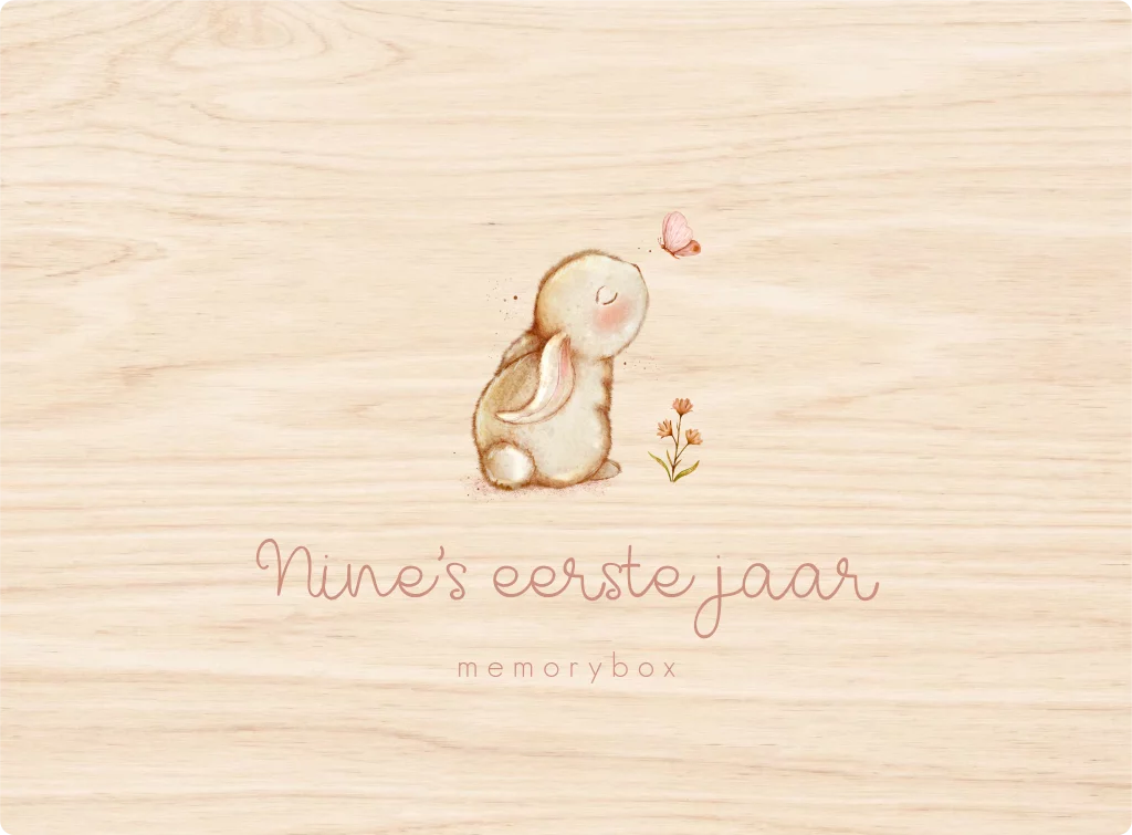 Wat een lieve memorybox voor jouw kindje. De box heeft een lieve illustratie van een konijntje met vlinder. Pas het ontwerp naar wens aan in onze online editor.