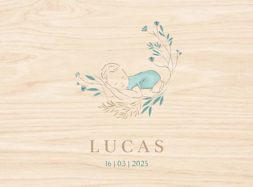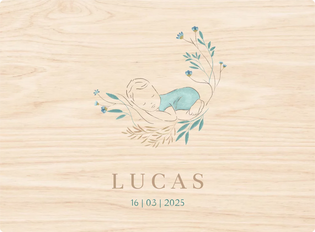 Een toffe memorybox voor jouw kindje of als kraamcadeau. De box heeft een lieve tekening van een jongen tussen de takjes. Pas het ontwerp naar wens aan in onze online editor.