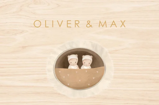 Bewaar alle belangrijke momenten, spulletjes en herinneringen in deze mooie houten memorybox, helemaal passend bij het geboortekaartje. De box heeft een mandje met daarin een tweeling met daarboven de namen van jullie kindjes in een okergele tint. Bewerk het ontwerp naar eigen wens, door bijvoorbeeld de kleuren aan te passen of tekst toe te voegen.