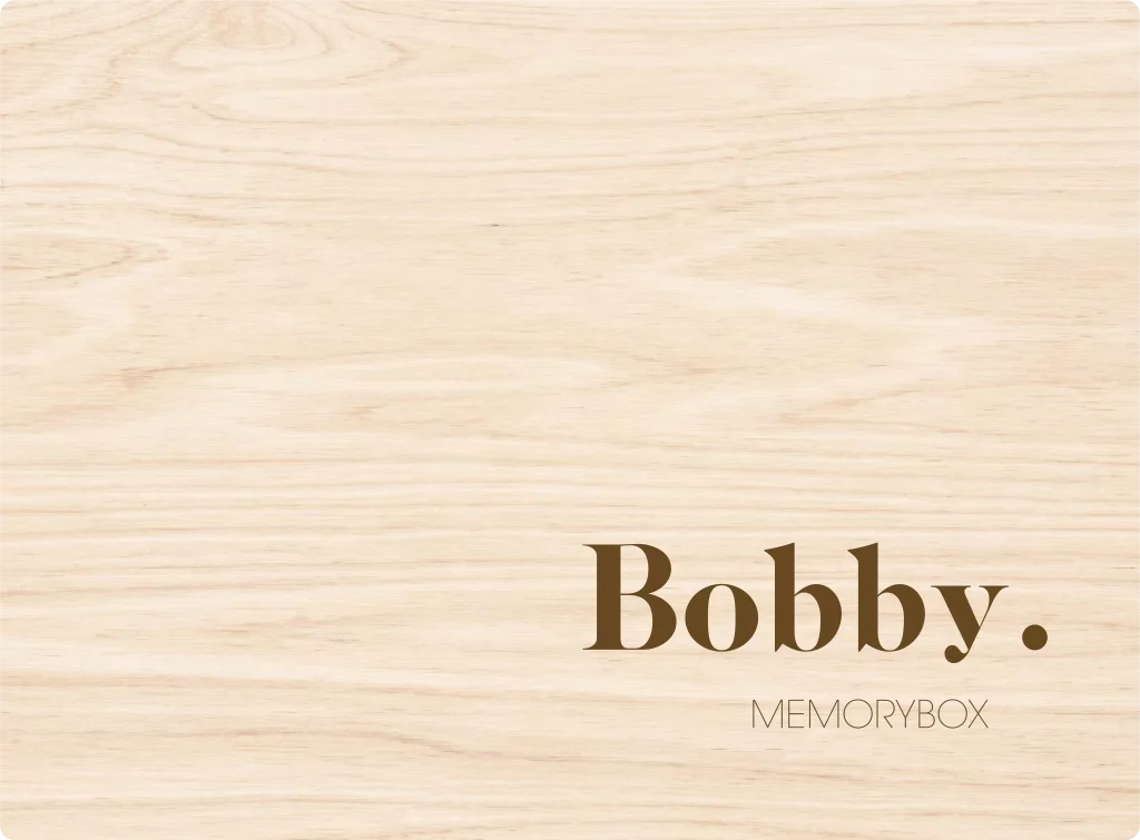 Een stijlvolle memorybox met minimalistische opmaak. Je leest de naam van het kindje op het ontwerp in bruine letters. Pas het ontwerp naar wens zelf aan.
