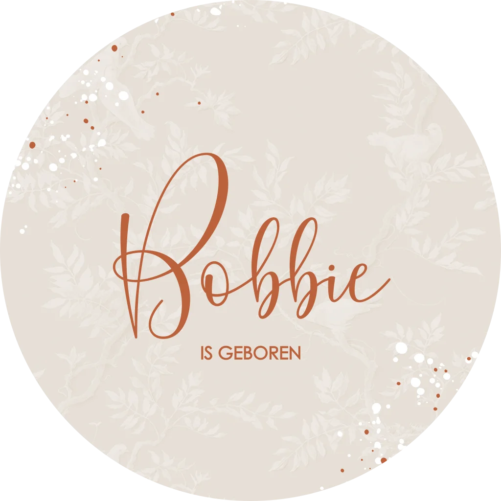 Kondig de geboorte van jullie kindje aan met deze ronde raamsticker, met een beige achtergrond, witte takjes en naam van jullie kindje. De sticker is naar wens aan te passen in onze online opmaaktool. Tip: zonder geboortedatum kun je de sticker al voor de geboorte in huis halen!