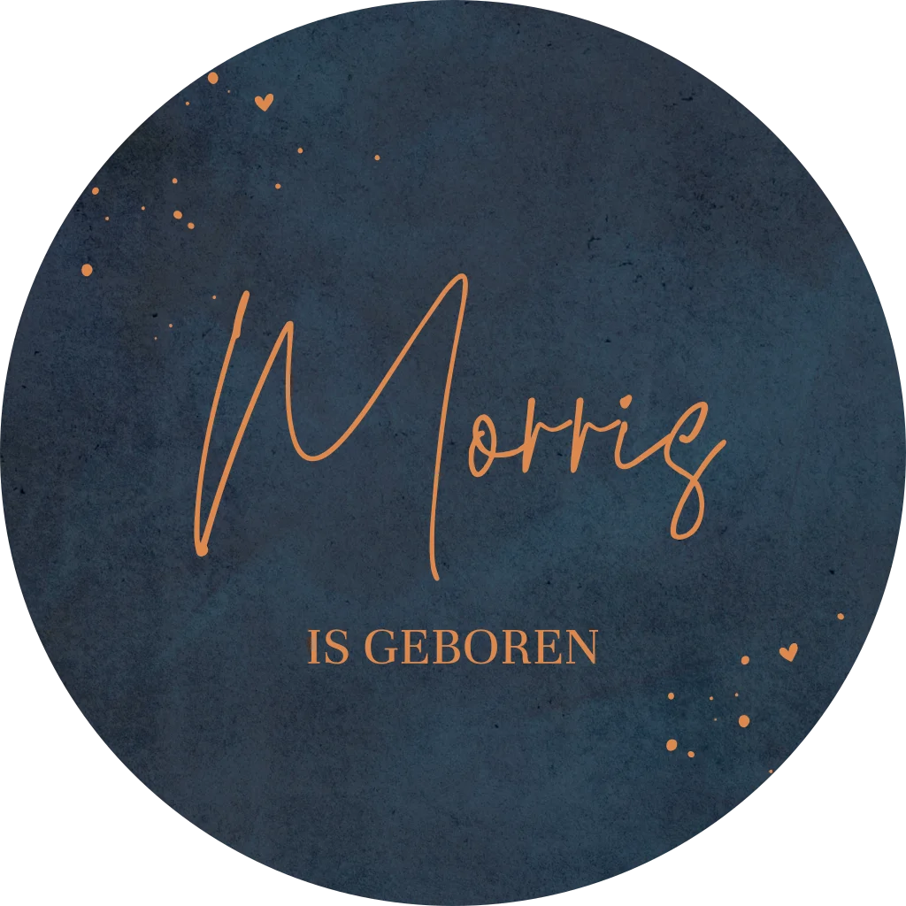 Kondig de geboorte van jullie kindje aan met deze ronde raamsticker, met een mooie blauwe velvet-look achtergrond en oranje naam en spetters. De sticker is naar wens aan te passen in onze online opmaaktool. Tip: zonder geboortedatum kun je de sticker al voor de geboorte in huis halen!