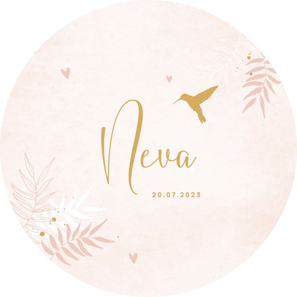 Een stijlvolle ronde raamsticker. De sticker heeft een lichtroze watercolour achtergrond met daarop de naam en een kolibrie. Pas het ontwerp naar wens aan in onze online editor.