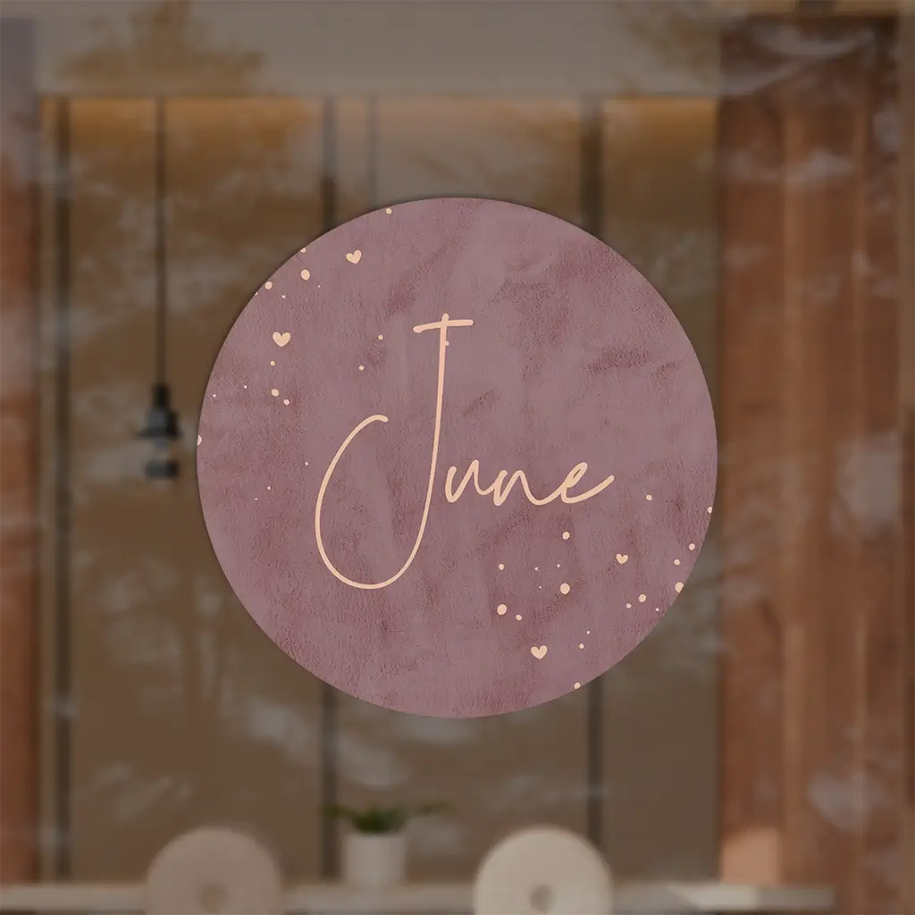 Met deze stoere raamsticker in aubergine paarse velvetlook laat je iedereen weten dat jullie dochter is geboren! De naam staat in pastelroze trendy letters centraal, langs de rand staan kleine hartjes in dezelfde kleur.