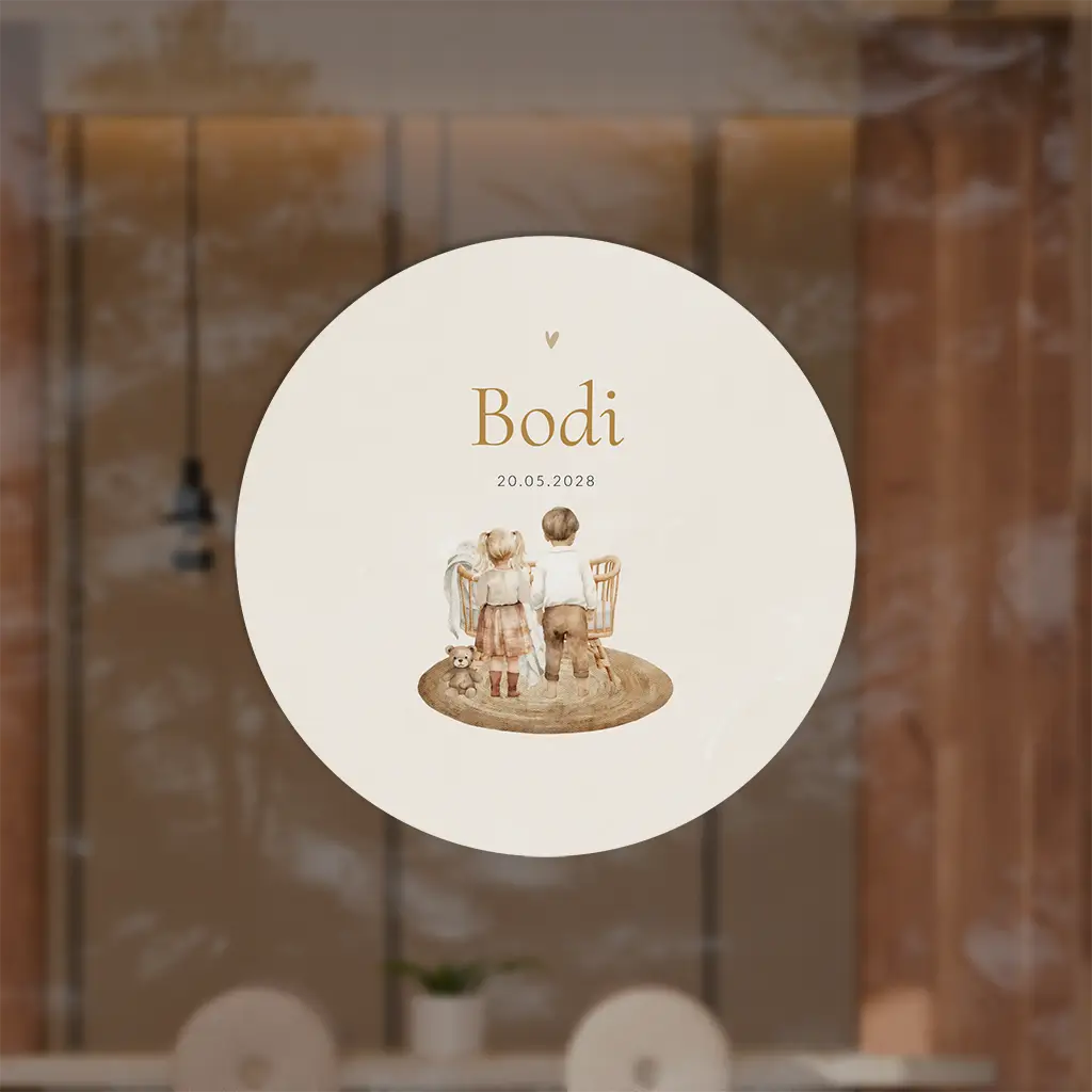 Een stijlvolle raamsticker voor jouw derde kindje. De sticker heeft prachtige natuurlijke kleuren met illustraties van een grote zus en broer bij het wiegje. Pas het ontwerp naar wens aan in onze online editor.