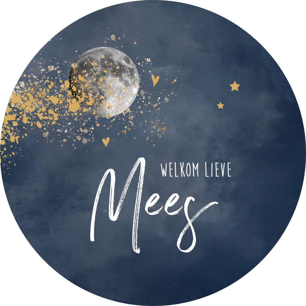 Yes, jullie zoontje is geboren, laat het iedereen weten met deze toffe donkerblauwe raamsticker in watercolour-look! De naam staat in witte hippe letters, erboven de maan met een wolk van goudkleurige spetters, sterren en hartjes.
