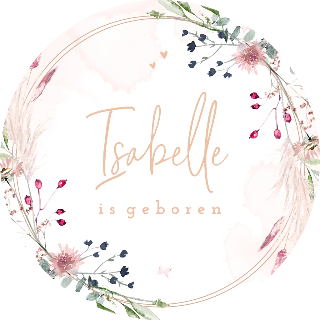 Met deze raamsticker zie je meteen dat er bij jullie een meisje is geboren, lief! Op de witte achtergrond staat roze aquarel met in het midden de naam van de kleine meid in sierlijke letters. Langs de rand een schattige bloemenrand in roze en paars en kleine takjes.