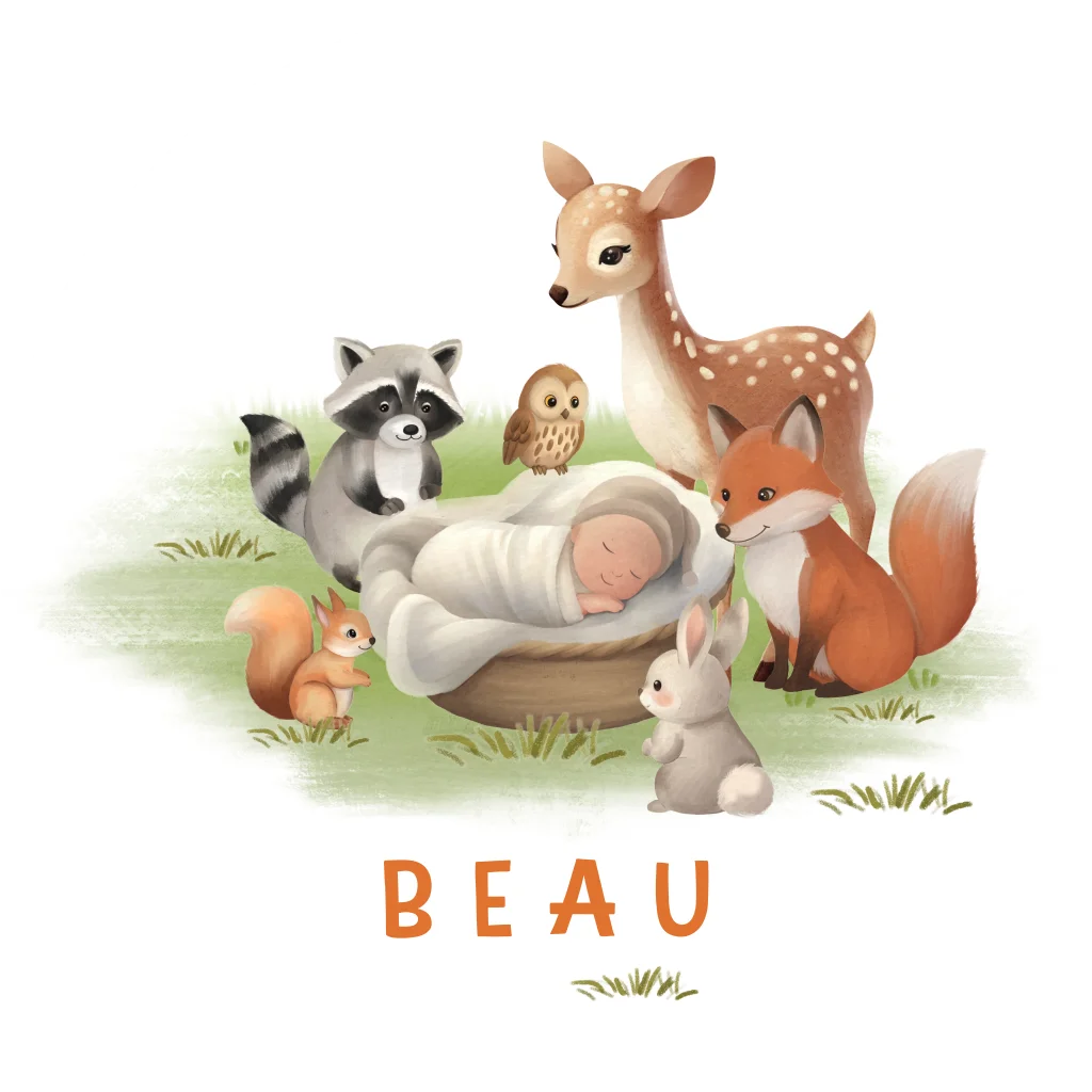 Een lieve raamsticker om de geboorte aan te kondigen. De sticker heeft een ronde vorm met daarop de illustratie van een baby in een mandje omringd door schattige bosdieren. Pas het ontwerp naar wens zelf aan.